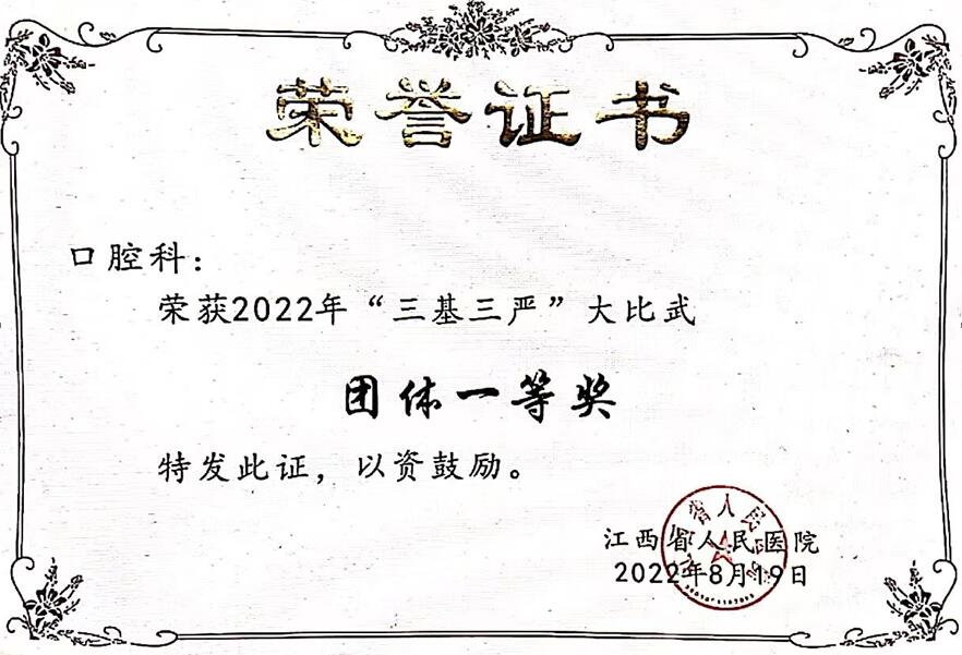 在江西省人民医院(南昌大学第一附属医院)举办的2022年度三基三严大比武中,我院荣获团体一等奖。